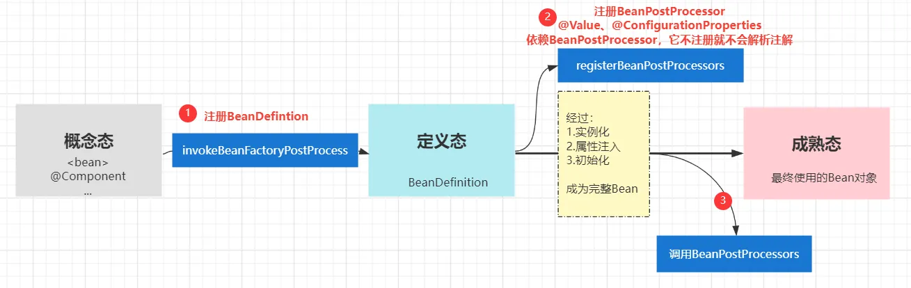 OK. 现在读取信息会了, 动态创建Bean也会了, 结合即可: 怎么结合 ? 想想 可以通过这两种方式: 1.EnvironmentAware(获取配置)+ImportBeanDefinitionRegistrar(创建Bean) 2.EnvironmentAware(获取配置)+BeanDefinitionRegistryPostProcessor(创建Bean) 通过@Value 和@ConfigurationProperties 注解方式获取配置为什么不可以?Why?~ 因为顺序原因!这里就要清楚: @Value 和@ConfigurationProperties注解依赖 BeanPostProcessor解析,要调用BeanPostProcessor就要先注册,而BeanPostProcessor的注册是在BeanDefinition的注册之后的。 所以在注册BeanDefinition时是获取不到注解绑定的配置信息的: